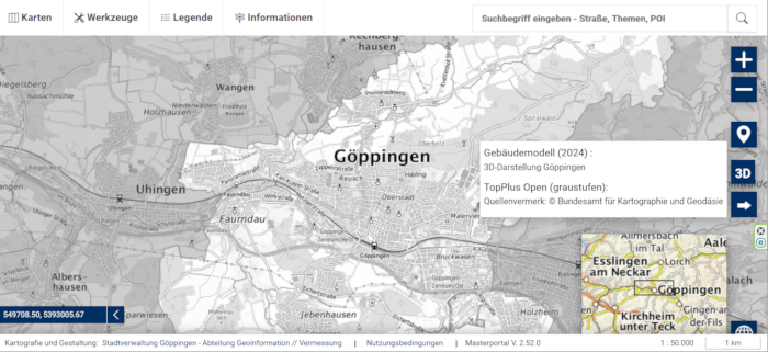 Das Geoportal ist auf der Homepage der Stadt unter www.goeppingen.de verlinkt. Direkt kommt man über https://geoportal.goeppingen.de/stadtplan auf das Portal.